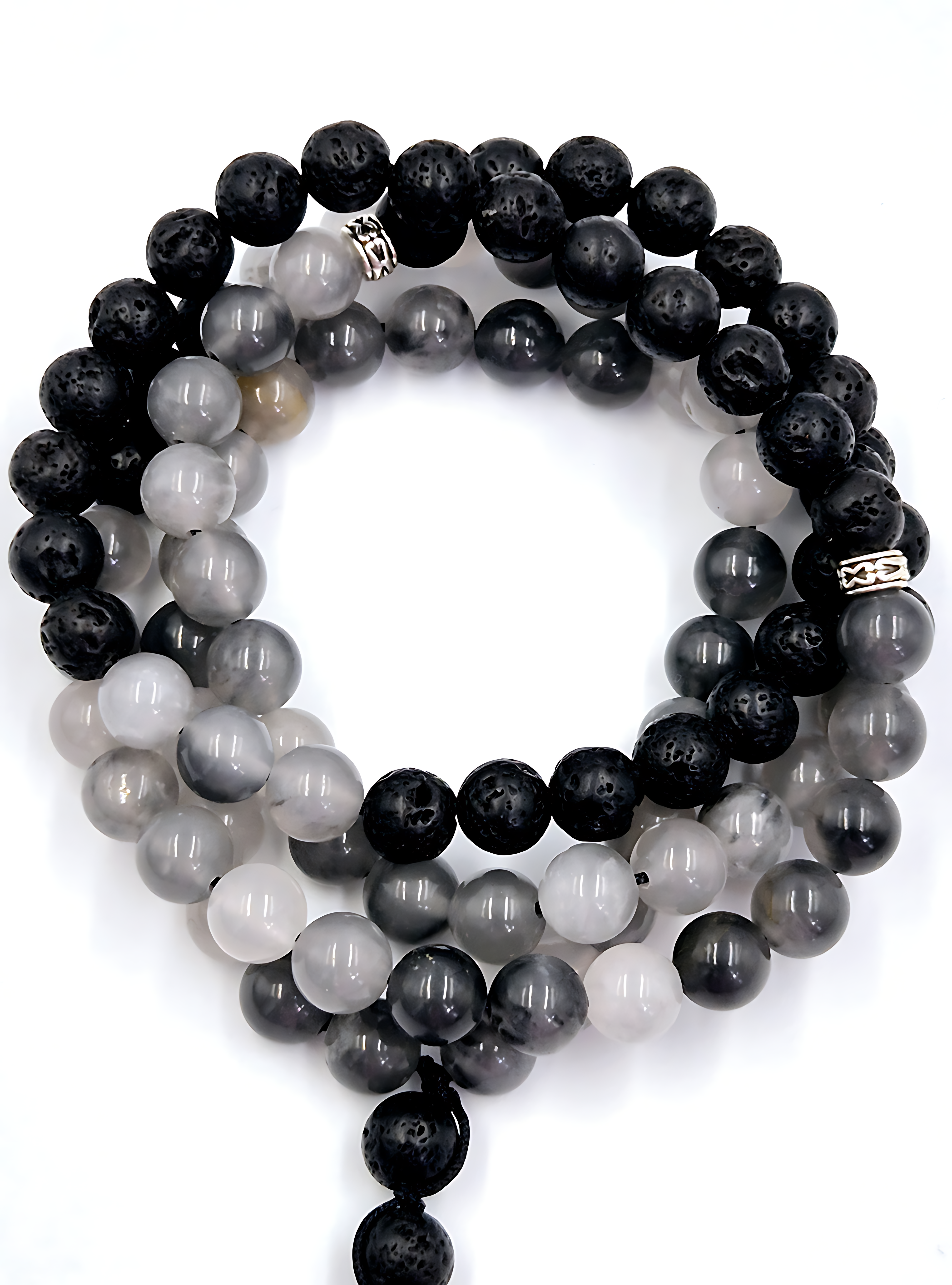 A striking contrast between ethereal mist and molten earth, this prayer bead set alternates between Cloud Quartz and Lava Stone, capturing the journey from chaos to clarity. Cloud Quartz, with its soft, dreamy translucence, forms over millennia as quartz crystallizes in shifting geological landscapes, embodying the calm of drifting clouds. Lava Stone, forged in Earth’s fiery depths, carries the rugged texture of volcanic flows, a testament to nature’s power. Together, these stones create a bead set that tells the story of transformation, resilience, and the delicate balance between strength and serenity.