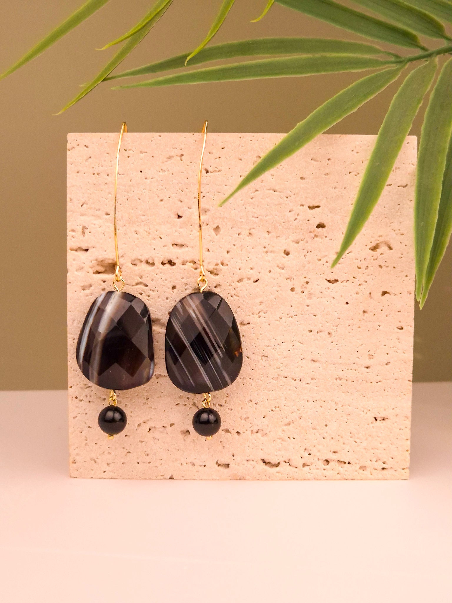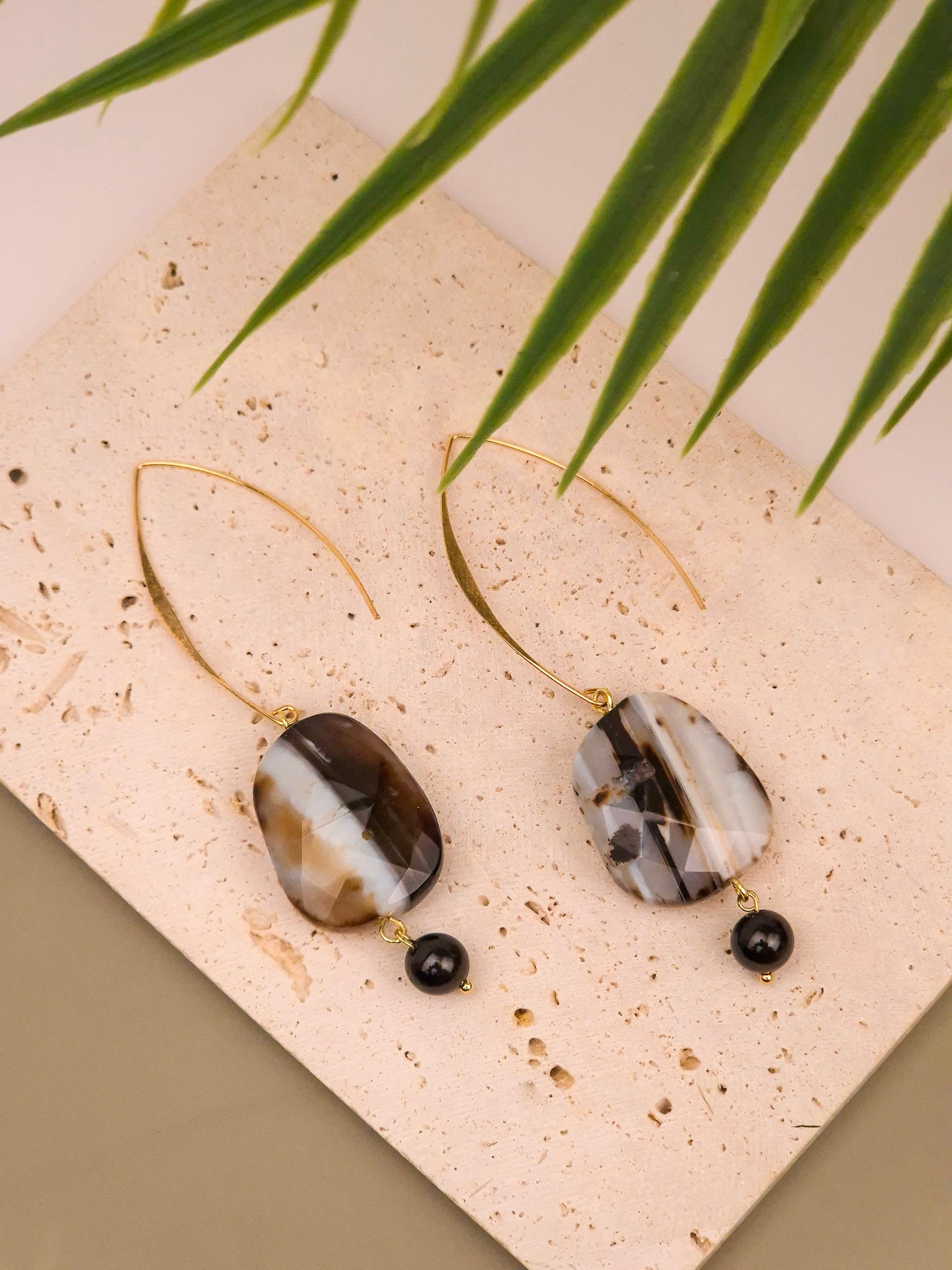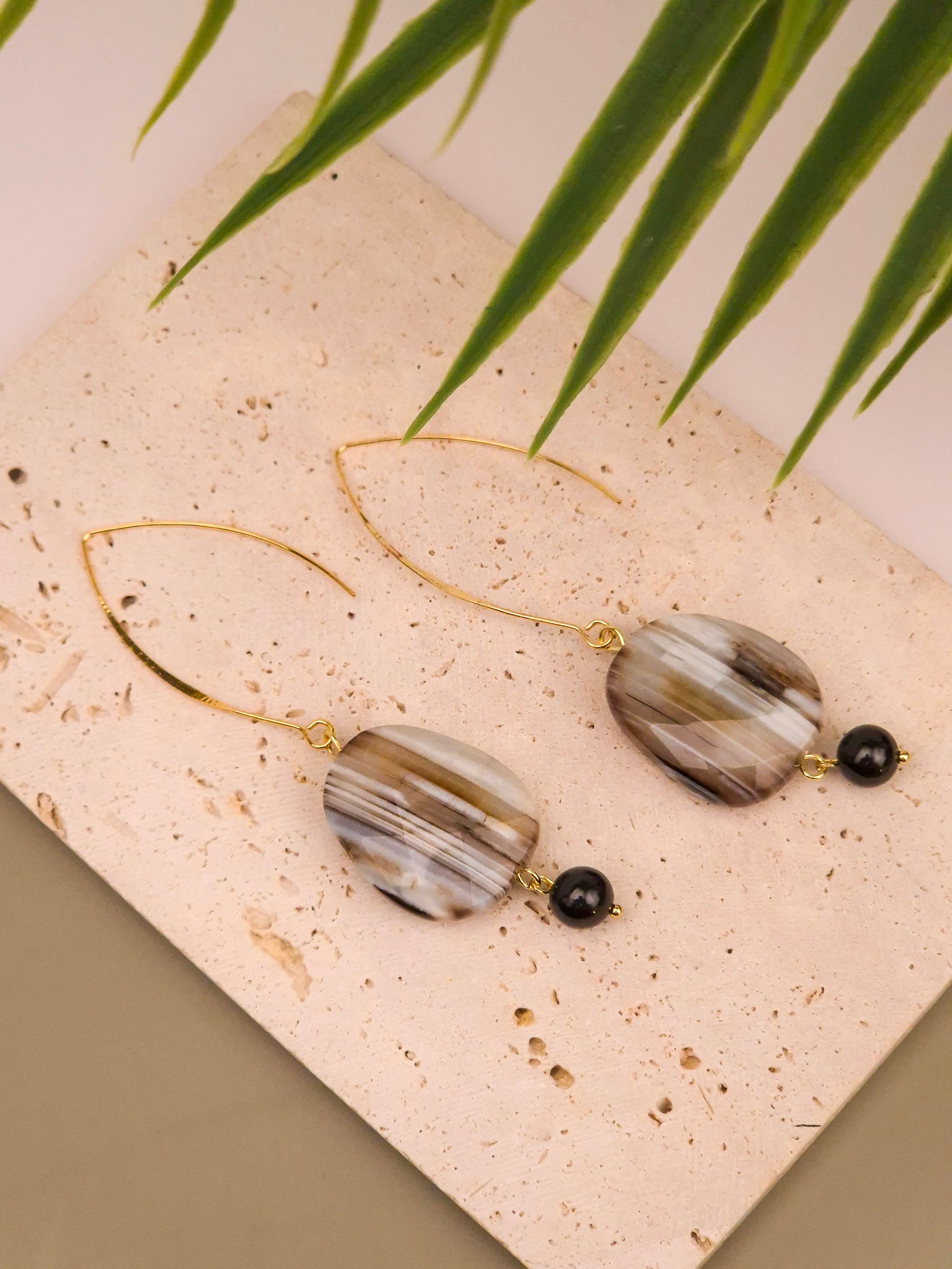 Earthy elegance and grounding energy — this pair features hand-cut Botswana Agate stones with natural banding, suspended from sleek gold threaders for a refined yet soulful statement.
