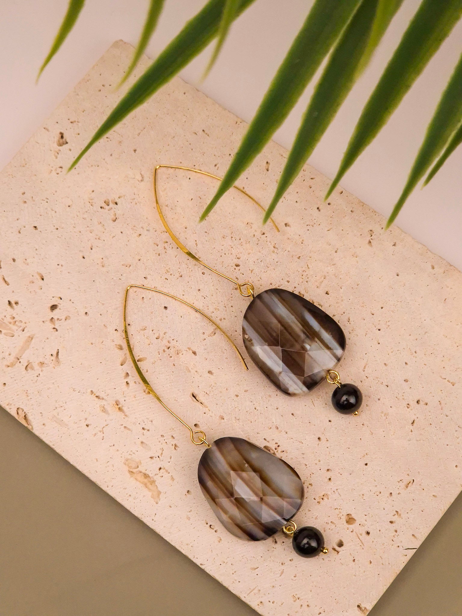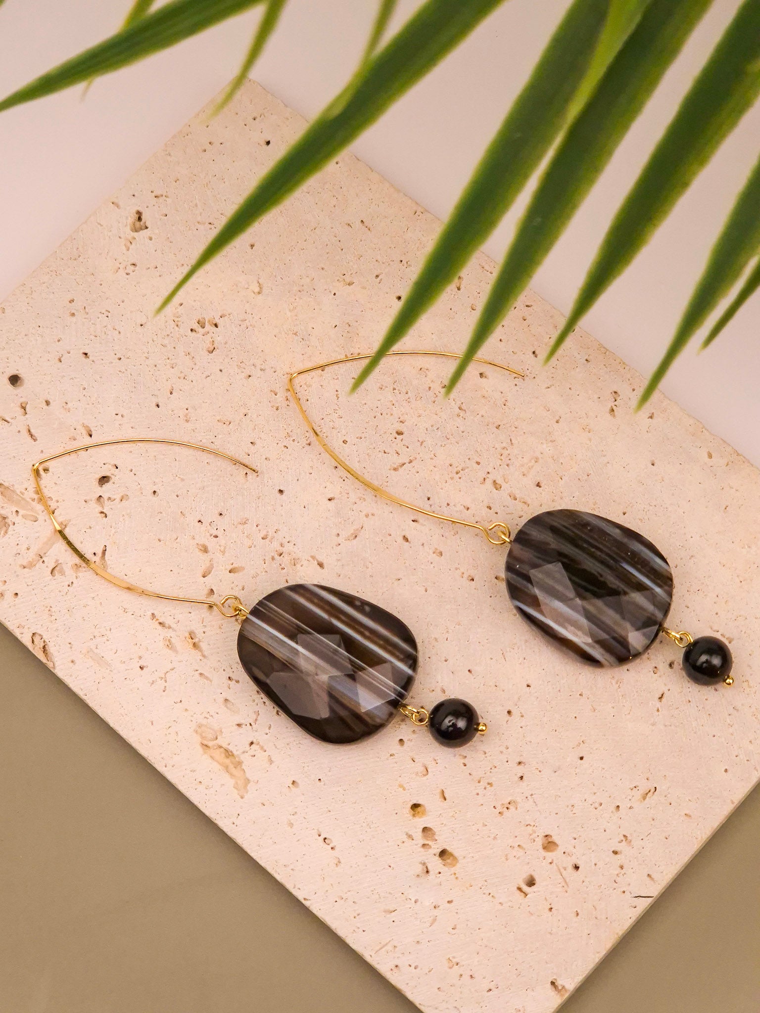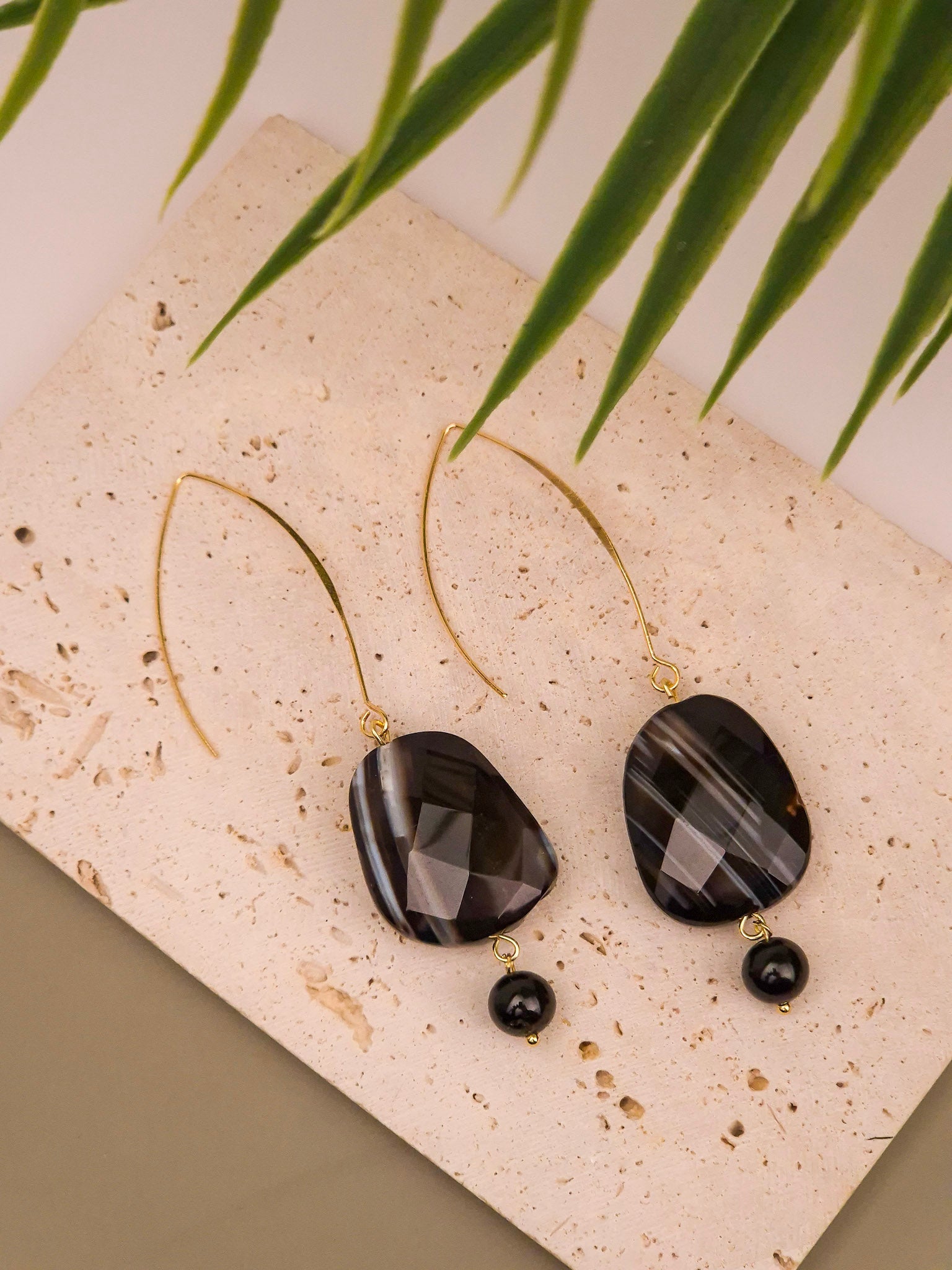 Earthy elegance and grounding energy — this pair features hand-cut Botswana Agate stones with natural banding, suspended from sleek gold threaders for a refined yet soulful statement.