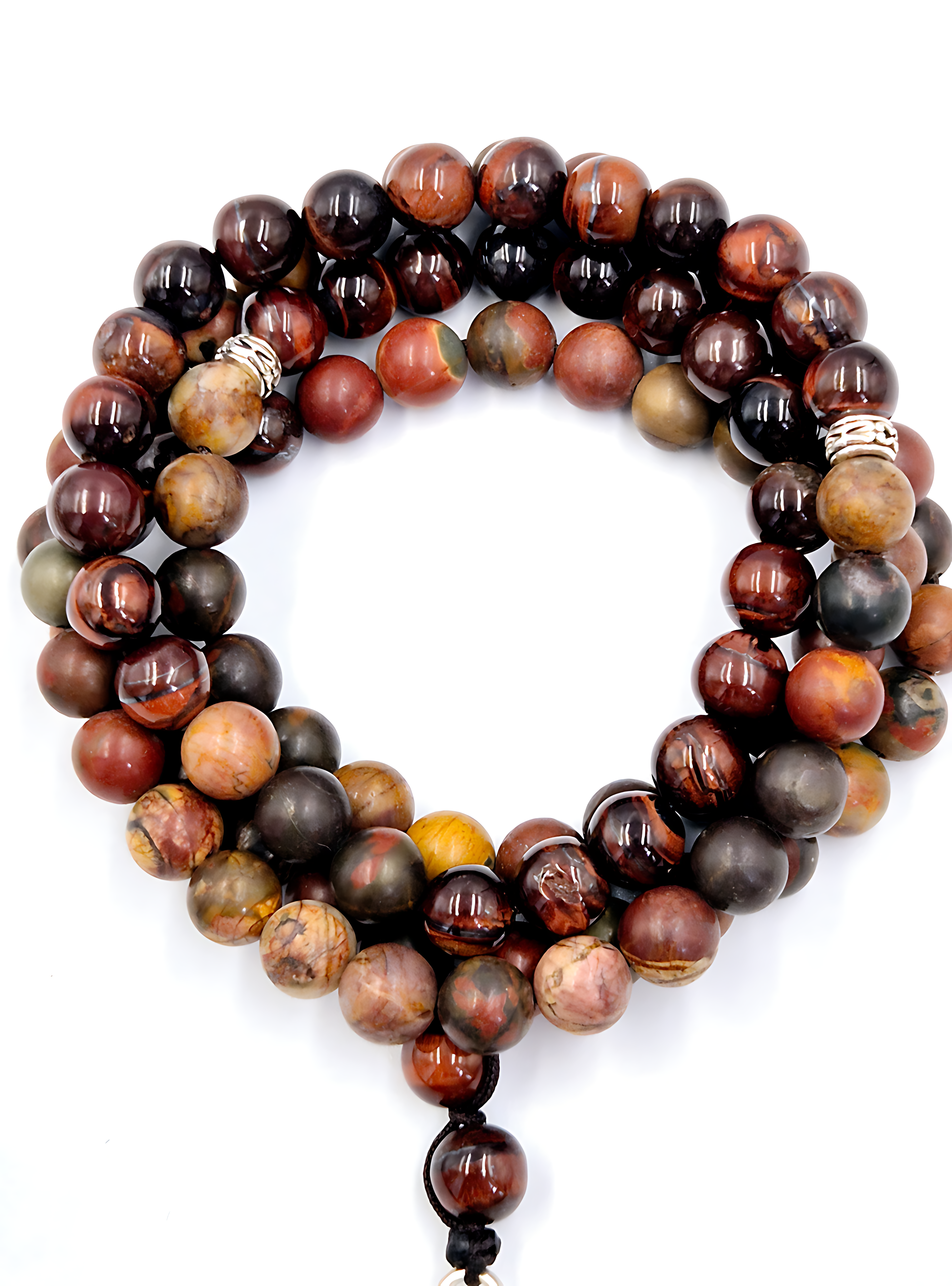 Like a masterpiece crafted by nature, this prayer bead set features Picasso Jasper as the dominant stone, with bold accents of Red Tiger Eye, creating an elegant interplay of pattern and fire. With its abstract, earthy patterns, Picasso Jasper has been admired for centuries as nature’s work of art. Red Tiger Eye, glowing with ember-like streaks, adds a vibrant contrast, evoking the passion and depth of molten landscapes. Together, they form a bead set that reflects the balance between raw artistic expression and the fiery essence of transformation.