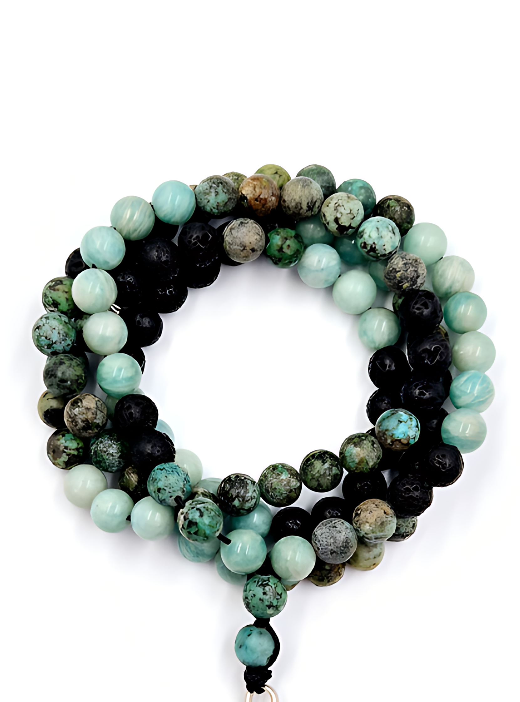 Crafted from Earth’s most captivating elements, this prayer bead set alternates between African Turquoise, Blue Amazonite, and Lava Stone beads, merging the essence of land, water, and fire. African Turquoise, a form of jasper, carries the intricate patterns of shifting minerals, reflecting nature’s evolving landscapes. Blue Amazonite, with its tranquil river-like hue, is formed from feldspar minerals reminiscent of flowing waters. Lava Stone, the most primal of Earth's creations, emerges from volcanic eruptions, preserving the texture of molten rock. Together, these beads symbolize harmony, endurance, and the sacred unity of the elements.