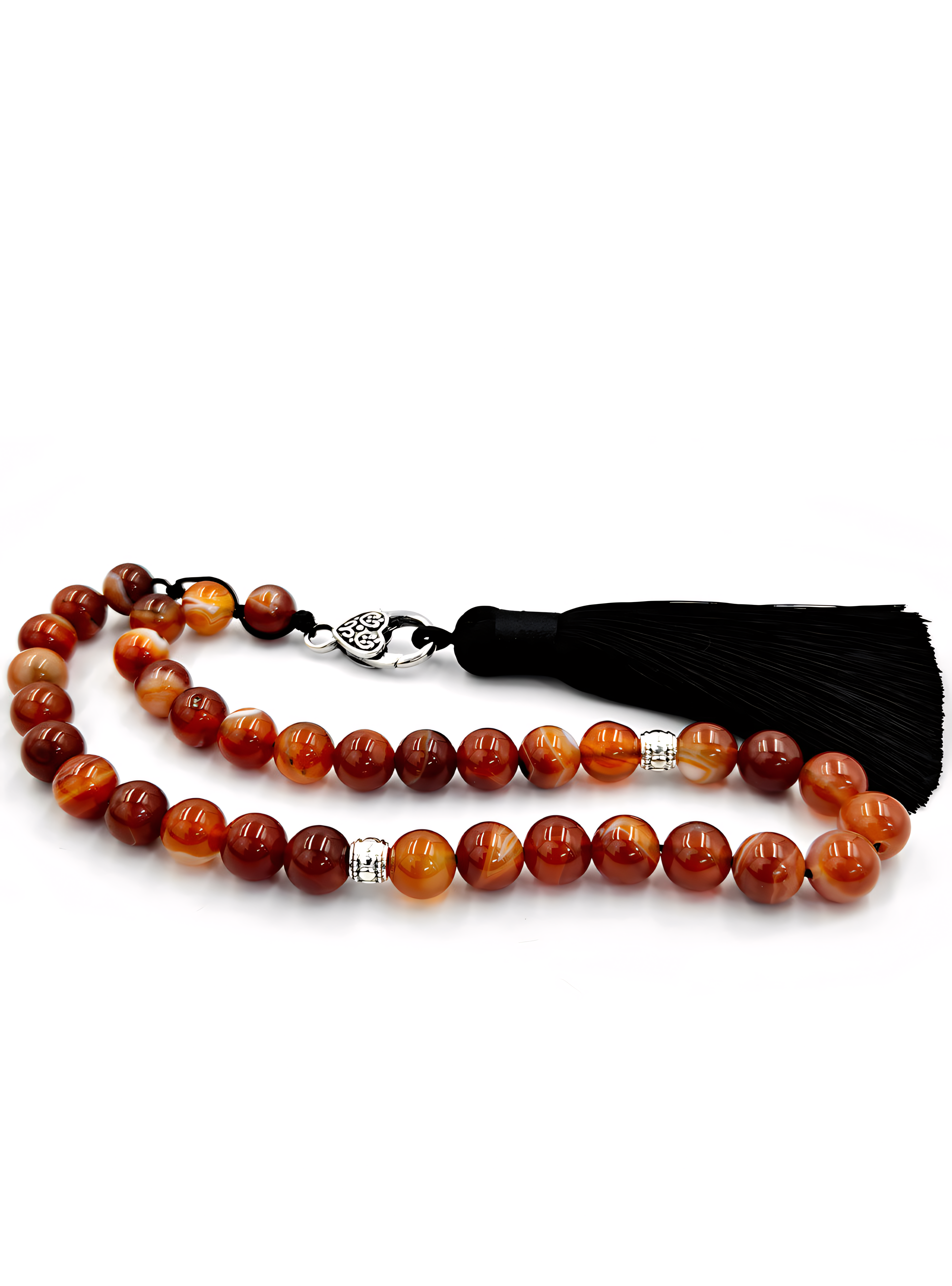 This prayer bead set is a radiant tribute to the warmth of the earth and the brilliance of fire. It is crafted from Orange Suleimani Agate, a gemstone celebrated for its fiery tones and captivating natural striations. With hues ranging from deep amber to sunset gold, each bead reflects the flickering glow of embers and the richness of desert twilight.