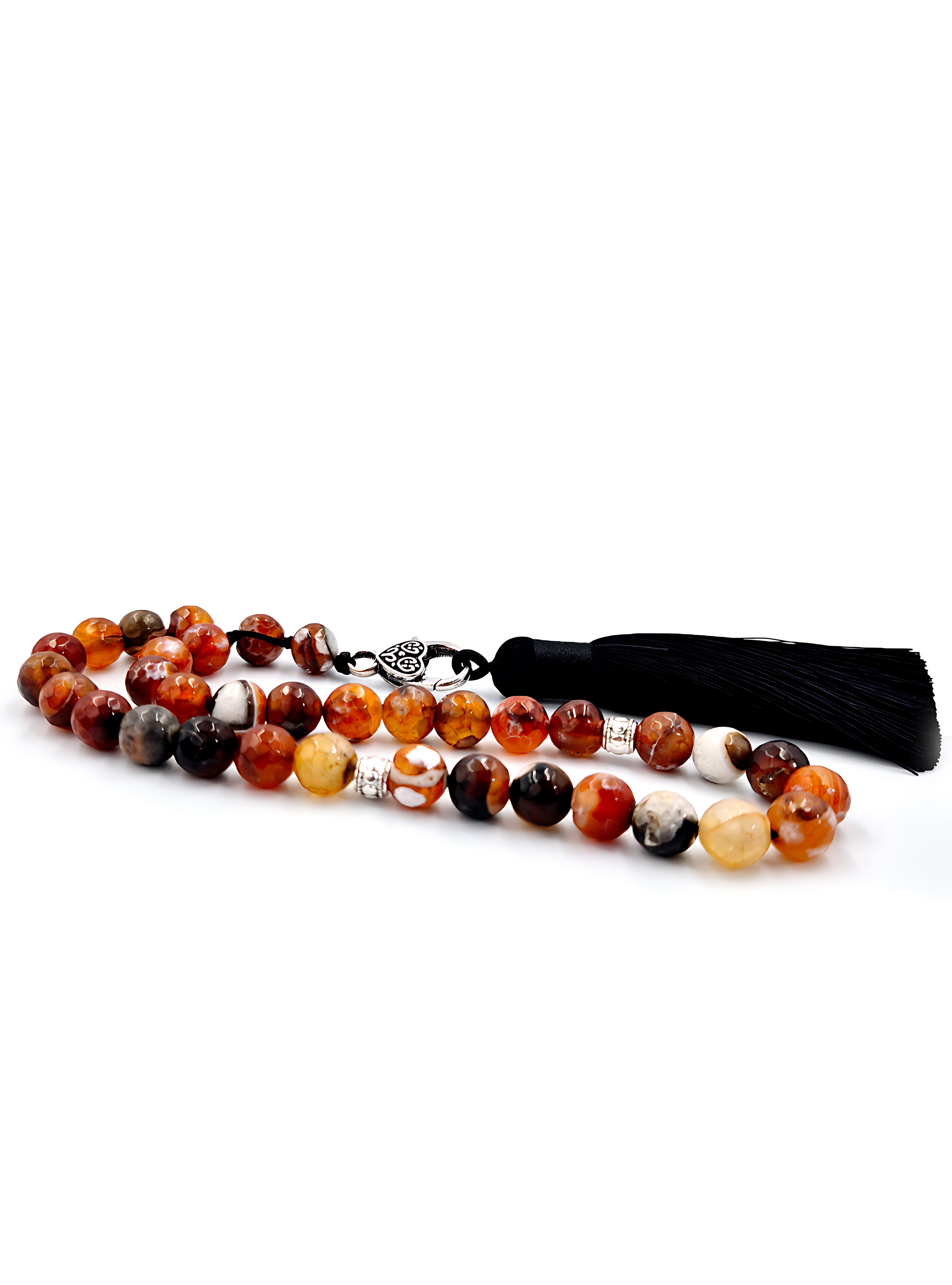 This prayer bead set is a stunning interplay of fire, shadow, and light. It alternates between Orange, Black, and White Agate, mirroring the ever-changing tones of glowing embers against the night sky. Orange Agate embodies warmth and movement, Black Agate offers grounding depth, and White Agate, with its soft translucence, reflects the purity of dawn’s first light.