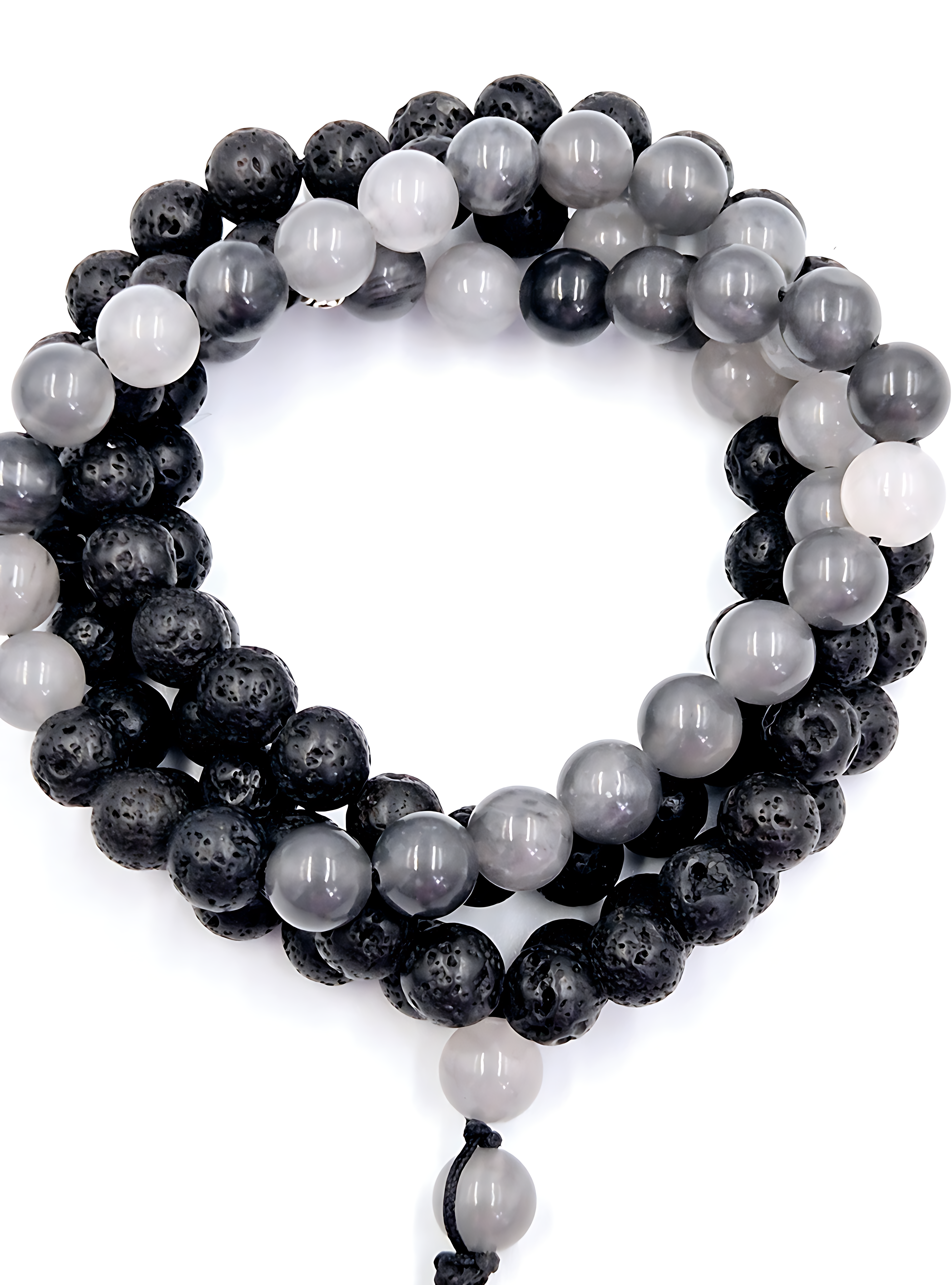 This prayer bead set alternates between Lava Stone and Cloud Quartz beads, embodying the powerful contrast between the earth’s fiery depths and the soft embrace of mist. Lava Stone, formed from molten magma that cooled into rugged volcanic rock, tells the story of Earth’s most dynamic transformations. Cloud Quartz, a gentle, semi-translucent quartz, develops over millennia as mineral-rich solutions slowly crystallize, capturing the mystery of drifting clouds. Together, these stones create a bead set of balance, resilience, and the harmony of fire and air.