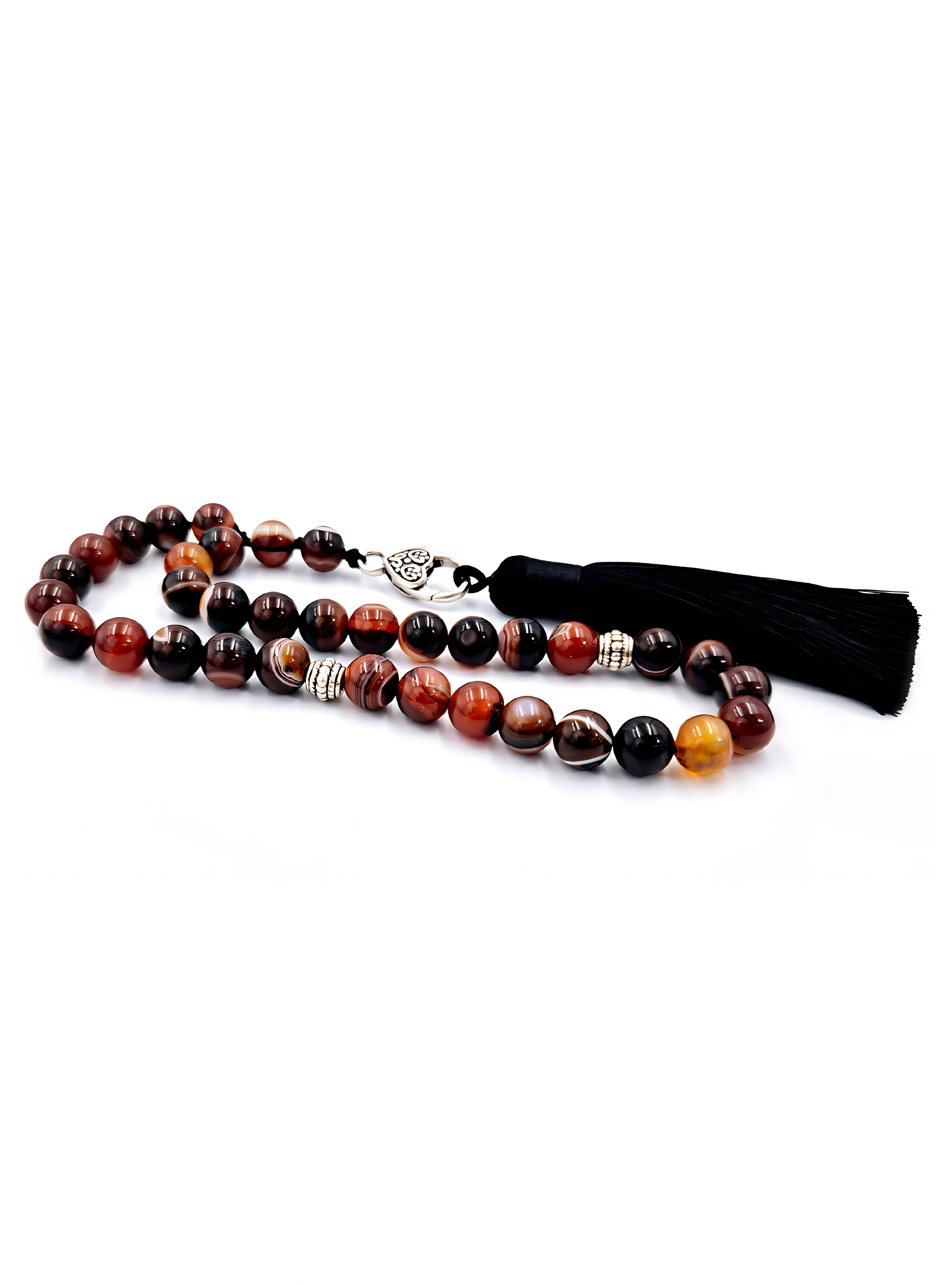 Like embers glowing in the darkness, this prayer bead set showcases vibrant Orange Suleimani Agate beads contrasted with deep Black Agate, creating a mesmerizing interplay of warmth and intensity. Orange Agate, known for its fiery tones, has been treasured in ancient markets for its striking beauty. Black Agate, bold and enigmatic, provides a grounding balance to the flame-like hues. Together, these stones create a bead set representing transformation, strength, and the flickering brilliance of history’s oldest elements.