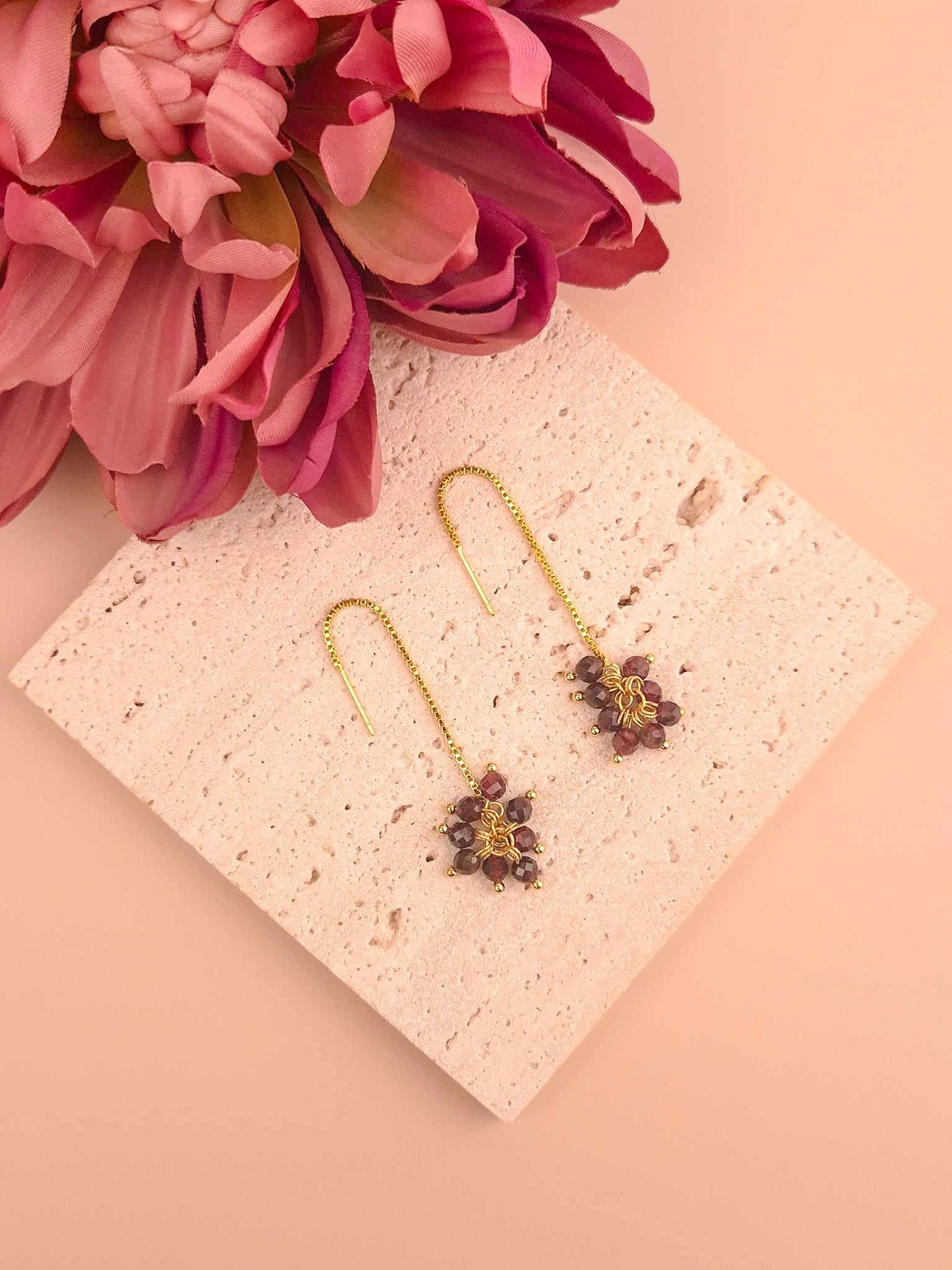Earrings: Threader-style long drops with Garnet clusters [Drop Length: ~5.5 cm]