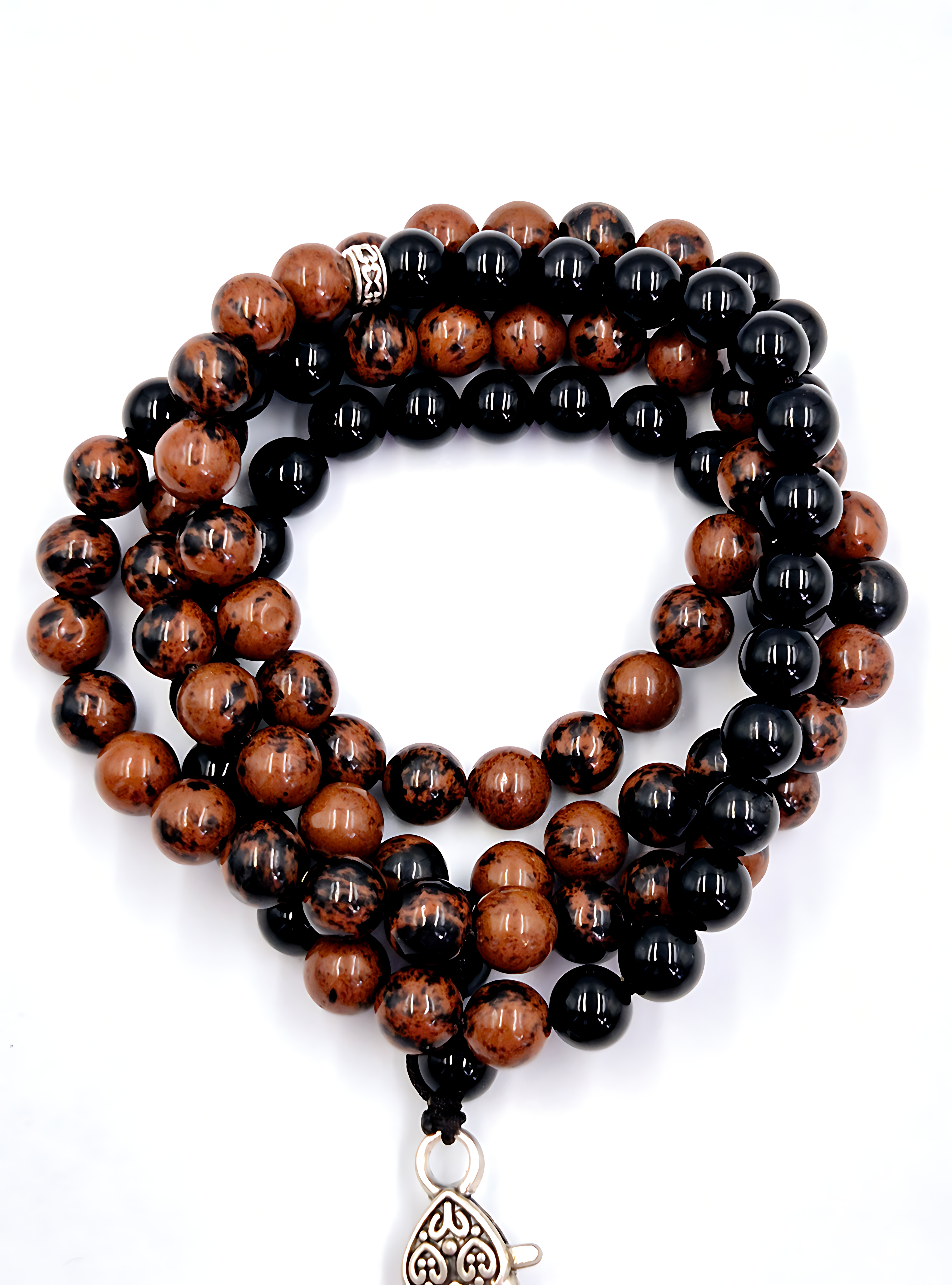 A tribute to Earth’s fiery past, this prayer bead set highlights Mahogany Obsidian as the dominant stone, complemented by Black Tourmaline accents. Mahogany Obsidian, born from the heart of volcanic eruptions, displays a mesmerizing mix of deep red and black, reminiscent of flowing lava. Black Tourmaline, a mineral formed under immense pressure, adds an elegant contrast with its rich, polished, jet-black hue. The result is a bead set embodying transformation, grounding, and the ancient fire power solidified in stone.