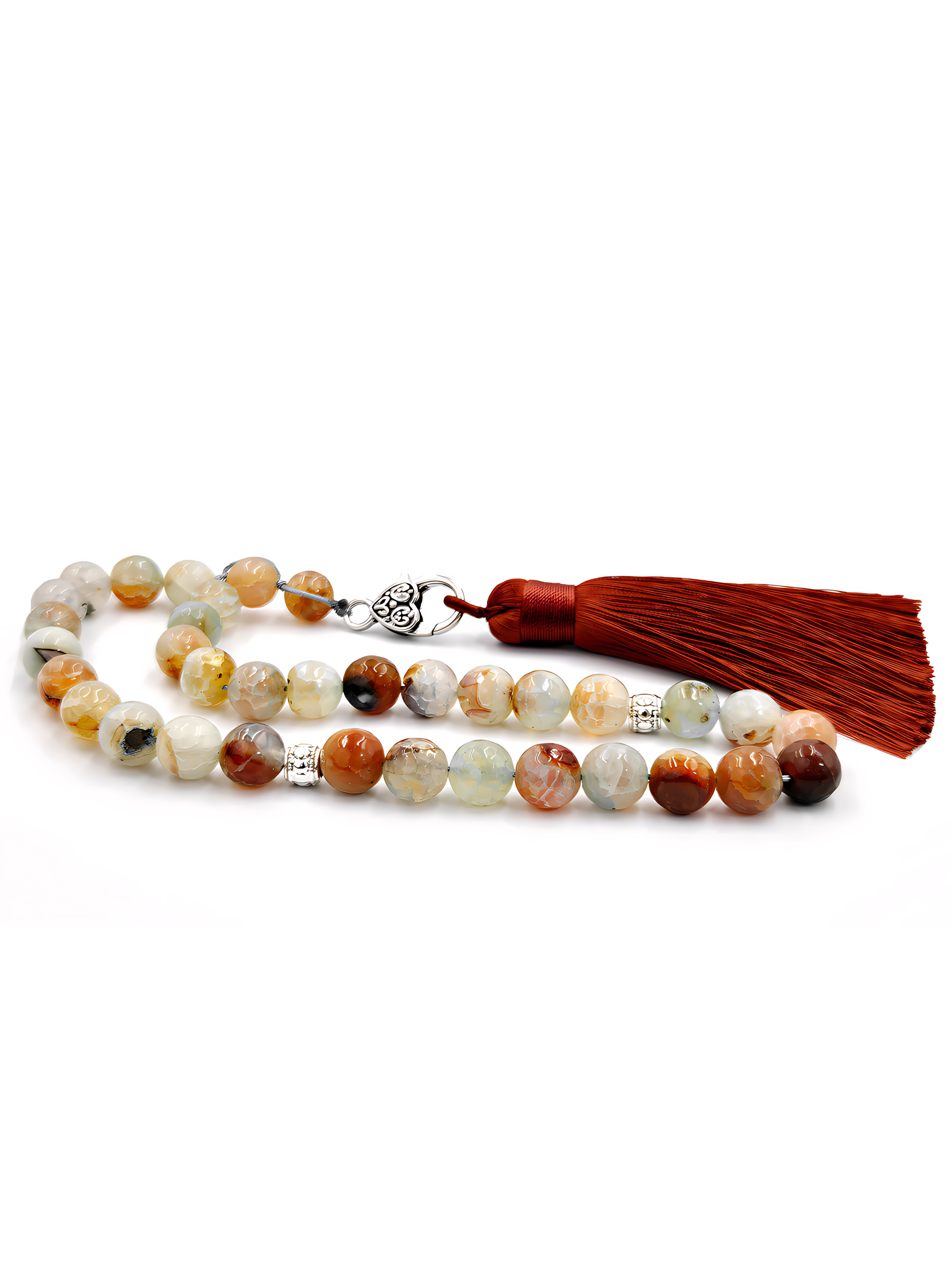 This prayer bead set features a breathtaking fusion of earth, sky, and fire. It features a mix of Blue, Orange, and Brown Agate, embodying the shifting hues of the horizon at sunrise and sunset. Blue Agate, with its deep and calming tones, reflects the vast expanse of the sky. Orange Agate, reminiscent of glowing embers, symbolizes warmth and movement. Brown Agate, formed through the slow layering of minerals over time, carries the richness of the earth’s oldest landscapes.