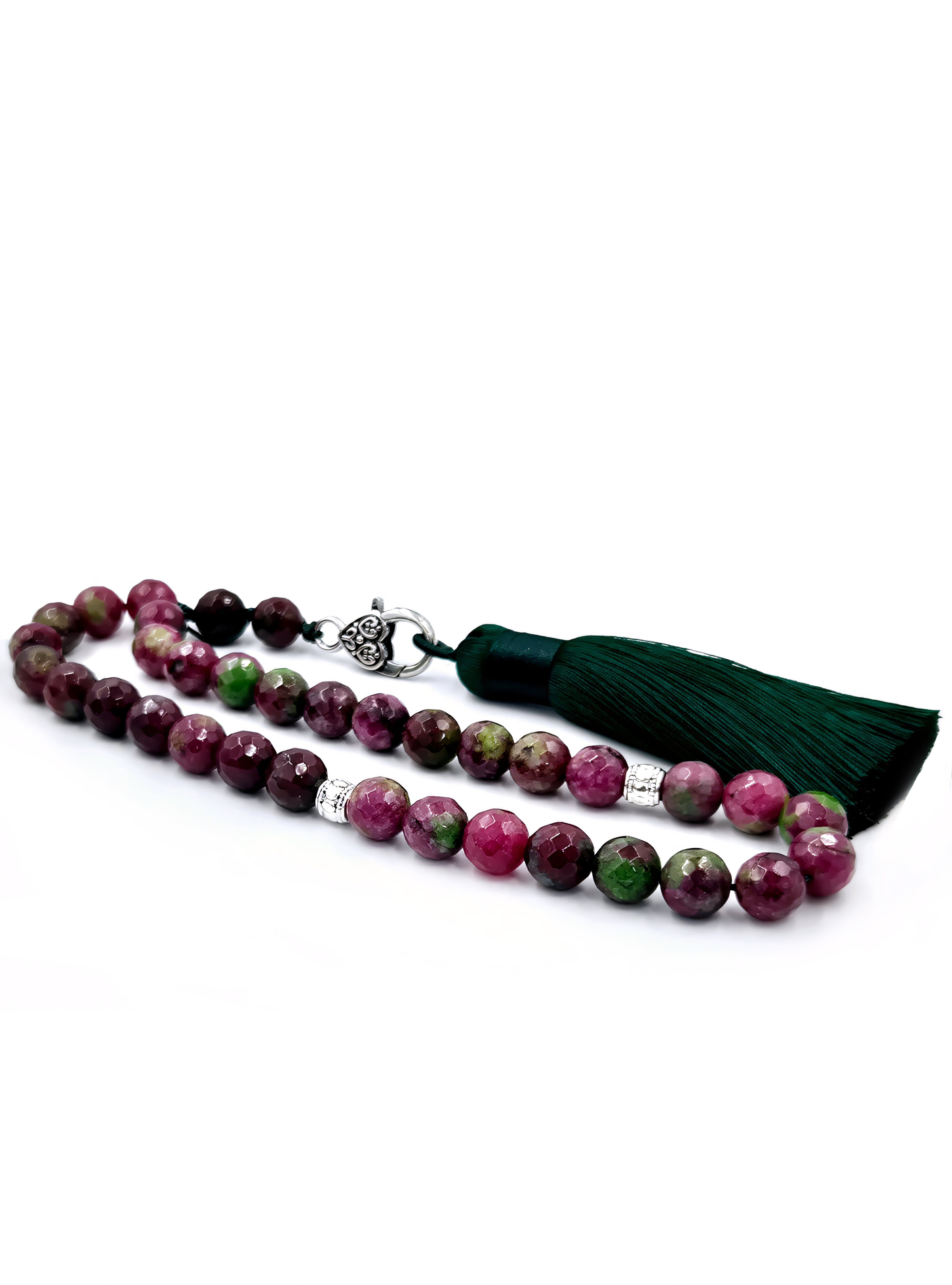 A stunning contrast of deep crimson and lush green, this prayer bead set is crafted from Ruby Zoisite (Anyolite), a rare gemstone formed by nature’s delicate balance of Ruby and Zoisite minerals. The vivid red inclusions of Ruby, set against the rich green Zoisite, reflect the beauty of contrast—the meeting of strength and renewal. Historically revered in Africa and India, this unique stone symbolizes the blending of elements, the endurance of time, and the richness of the natural world.