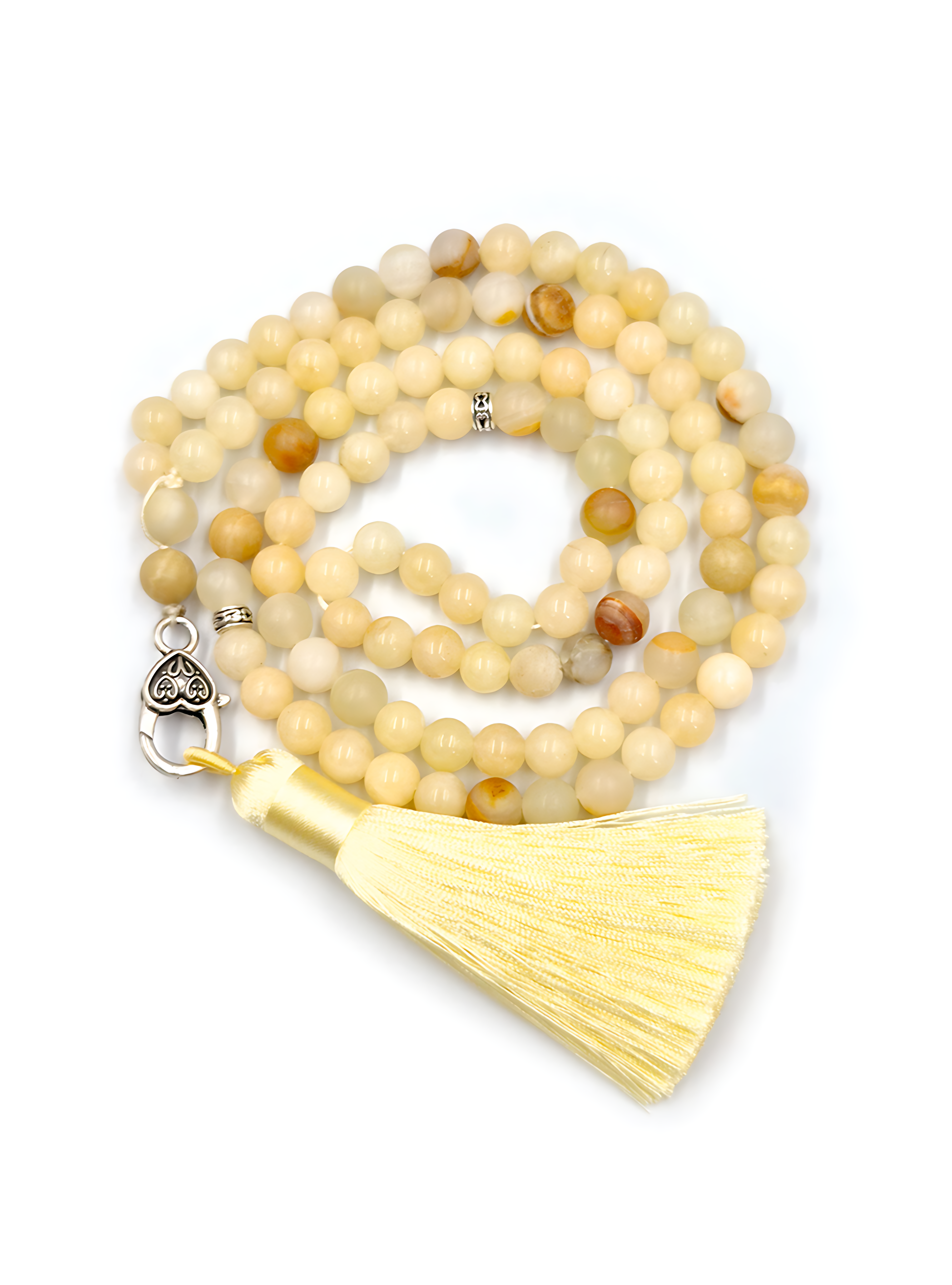 Inspired by the golden hues of ancient palaces and sacred temples, this prayer bead set weaves together the soft ivory glow of Alabaster Stone with the rich, honeyed warmth of Honey Jade. Alabaster Stone, known for its smooth, luminous surface, has been crafted into statues and artifacts since the earliest civilizations, symbolizing wisdom and purity. Honey Jade, formed through centuries of geological transformation, was cherished by artisans for its natural warmth and inviting glow. Together, they create a piece that embodies grace, refinement, and the golden light of history’s most treasured artifacts.