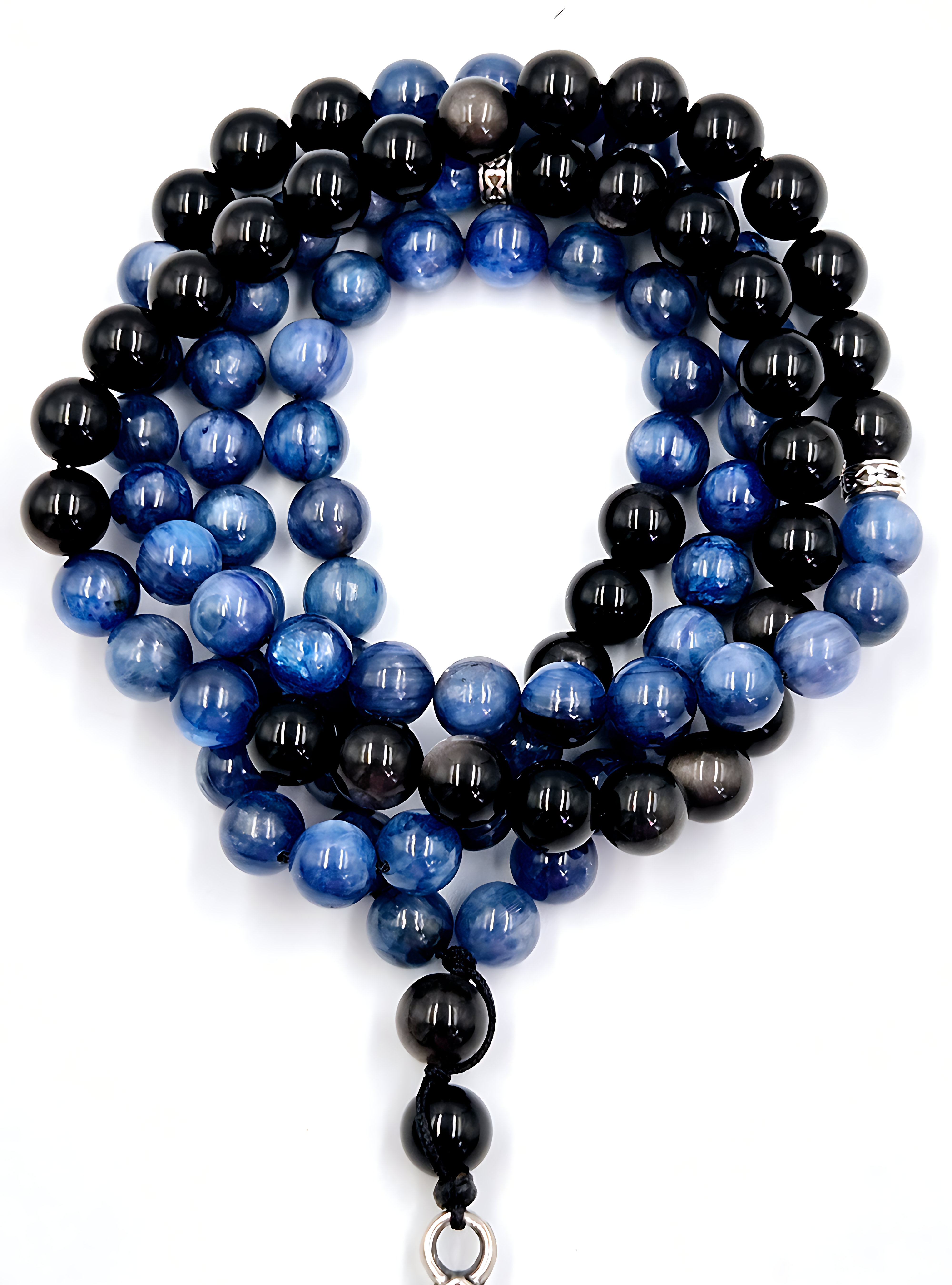 A fusion of frozen waves and molten fire, this prayer bead set alternates between Blue Kyanite and Silver Obsidian beads, reflecting the balance of opposites—stillness and motion, sky and earth. With its shimmering layers, Blue Kyanite forms in high-pressure metamorphic rocks, resembling the icy flow of glacial waters. Silver Obsidian, a volcanic glass, is created when molten lava cools rapidly, capturing the brilliance of liquid silver in solid form. Together, these stones create a set that embodies clarity, transformation, and the dance between fluidity and strength.