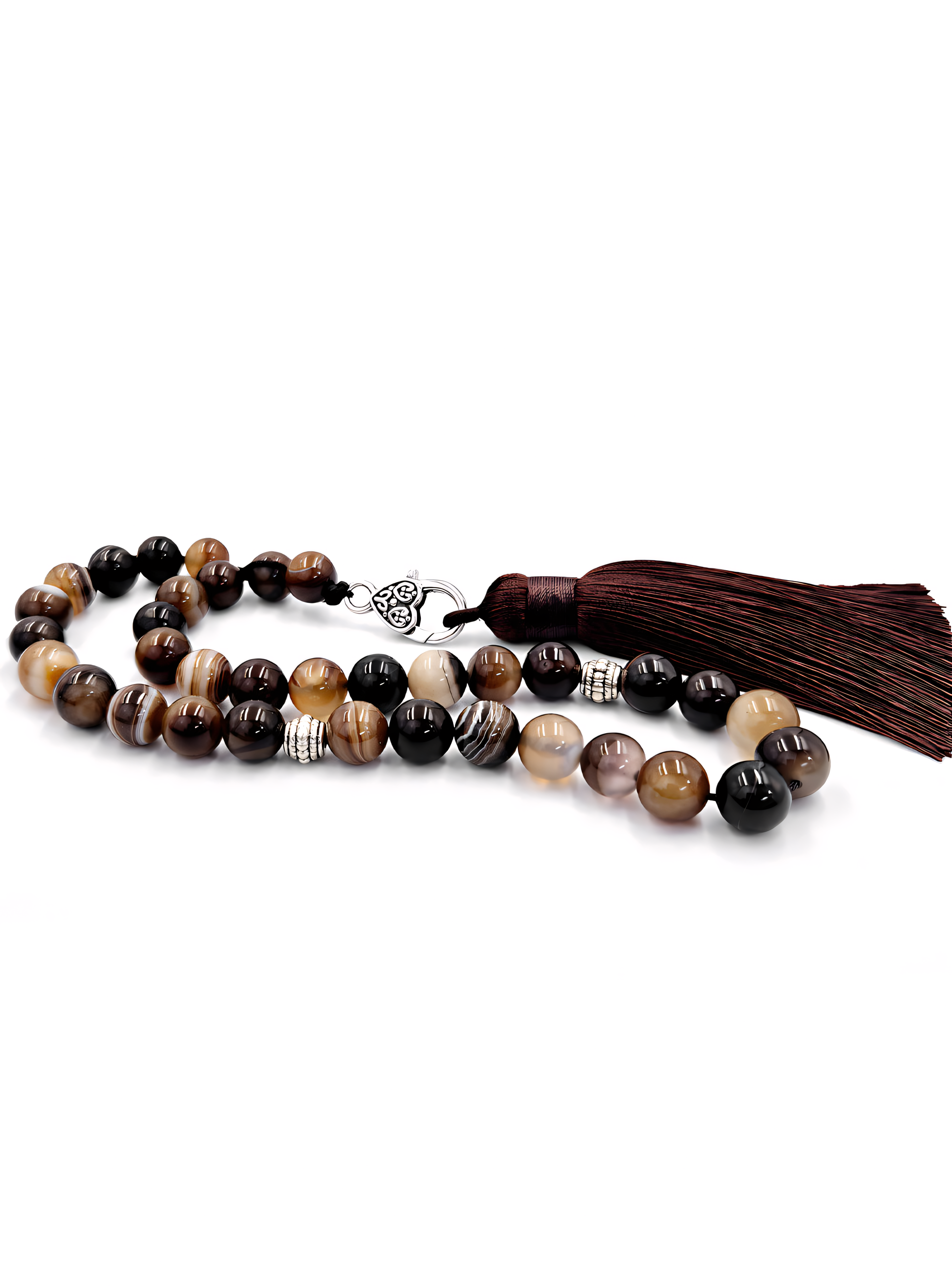This prayer bead set reflects ancient landscapes and enduring traditions. It features Brown and Beige Suleimani Agate, a stone renowned for its natural banding and smooth, polished surface. Brown Suleimani Agate, formed over centuries, holds the deep warmth of the earth, while Beige Agate, with its soft, sandy hues, mirrors the desert’s endless dunes.