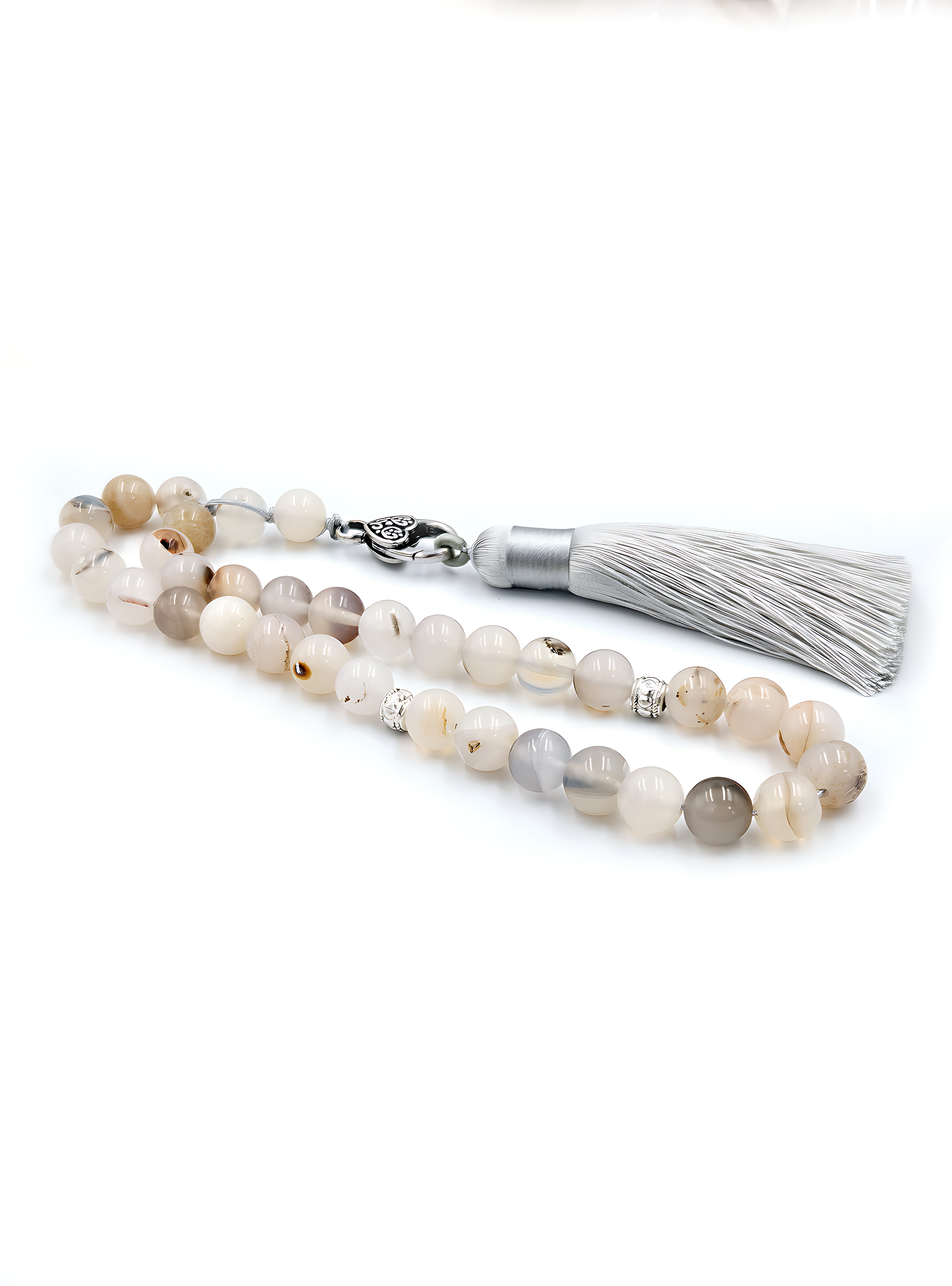 This prayer bead set reflects timeless strength and quiet resilience. It is crafted from Grey Agate, a gemstone formed through layers of mineral deposits over millennia. With its subtle, smoky hues, Grey Agate resembles the shifting mist over ancient landscapes, embodying balance and wisdom. Treasured by artisans for its smooth, polished surface, each bead carries the whispers of time and the quiet beauty of nature’s artistry.