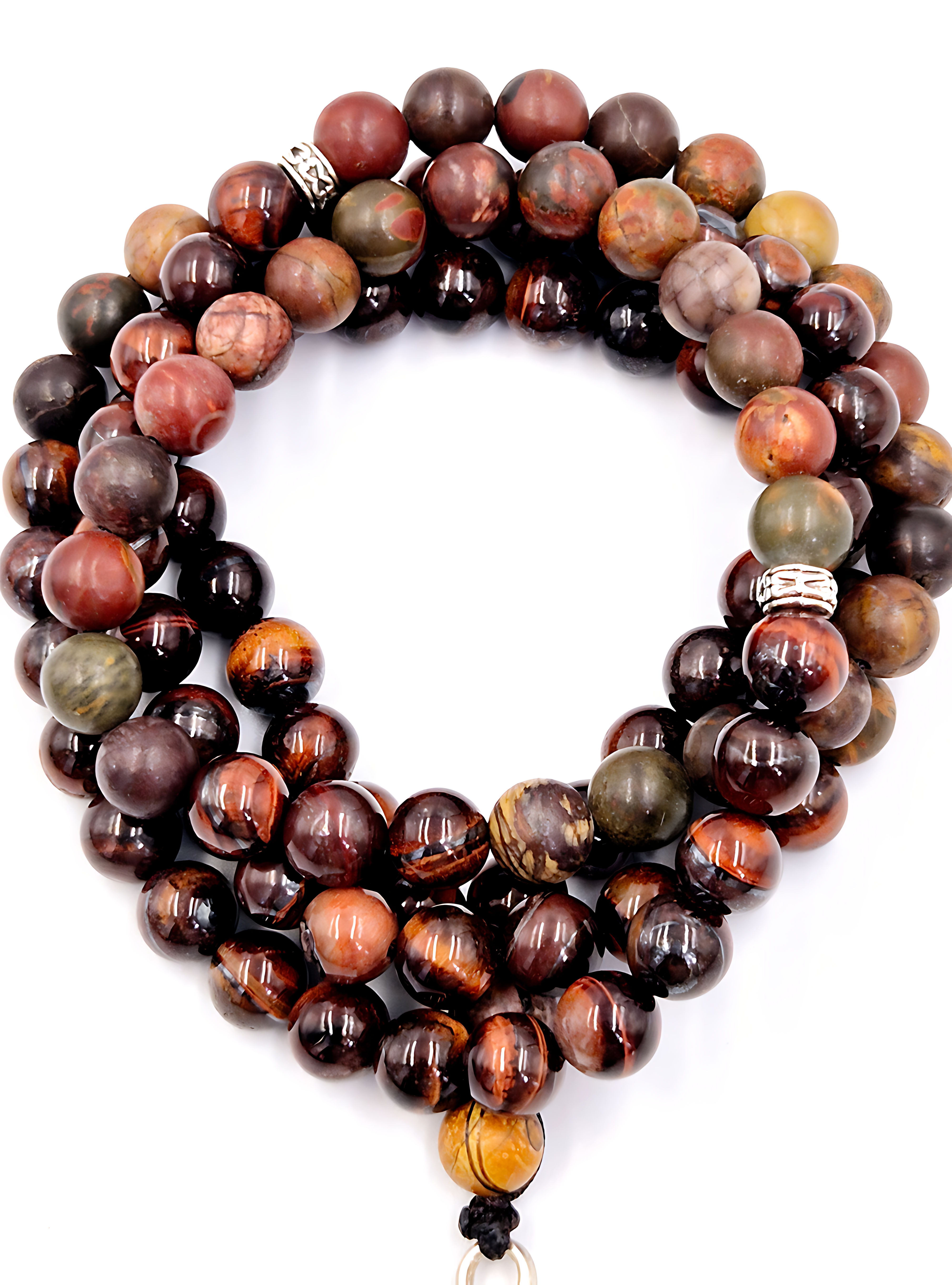 A bold interplay of fiery elegance and artistic earth tones, this prayer bead set features dominant Red Tiger Eye beads, accentuated by Picasso Jasper, forming a striking contrast. Red Tiger Eye, a gemstone shaped by nature’s transformative heat, glows with deep burgundy and ember-like streaks, reminiscent of flickering flames. Picasso Jasper, known for its painterly patterns of black, grey, and red, mirrors the strokes of an artist's brush on a stone canvas. Together, they create a bead set that embodies passion, artistry, and the timeless beauty of nature’s creations.