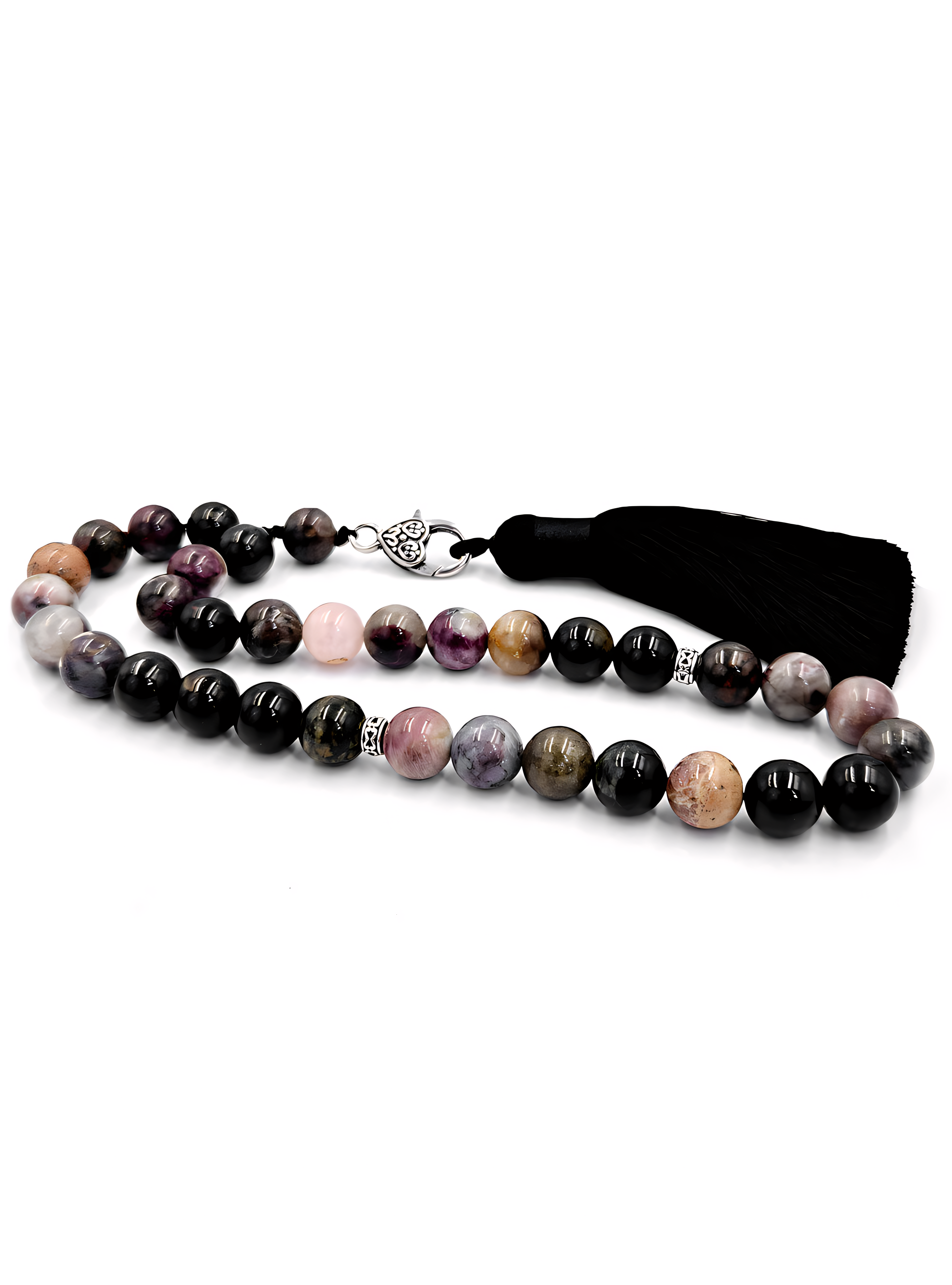 This prayer bead set strikes a striking contrast between depth and vibrance. It blends the intense darkness of Black Tourmaline with the refreshing hues of Watermelon Tourmaline. Black Tourmaline, formed through the slow cooling of molten minerals, is revered for its bold, grounding presence. With its exquisite blend of deep green and soft pink, Watermelon Tourmaline mirrors the beauty of a twilight sky melting into dawn.