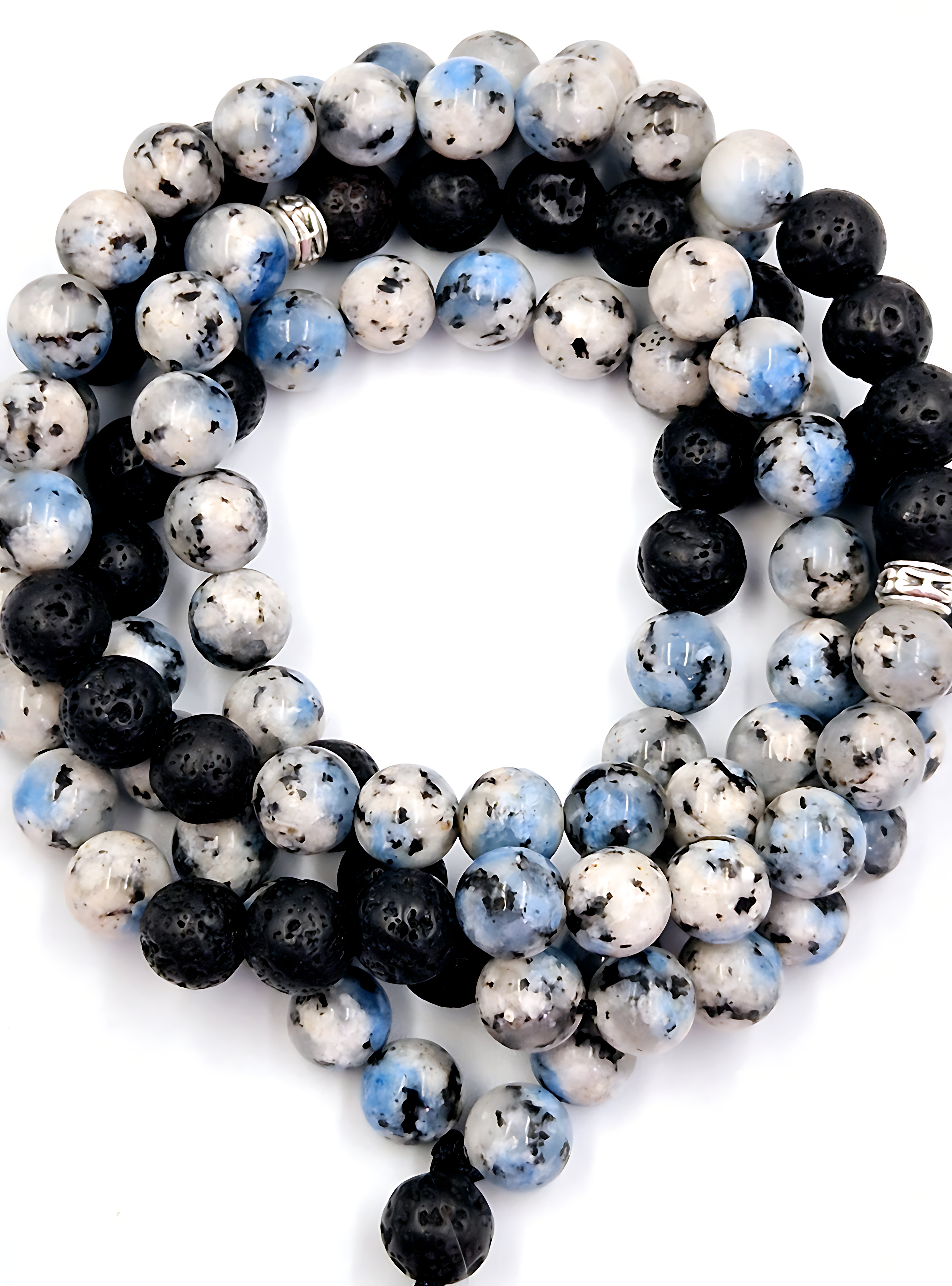 A meeting of sky-high mountains and deep volcanic earth, this prayer bead set alternates between K2 Stone and Lava Stone beads, symbolizing nature's extremes. K2 Stone, a rare granite found at the base of the world’s second-highest peak, features striking blue azurite inclusions, a rare phenomenon in natural stone formations. Lava Stone, born from Earth’s molten core, reflects creation's raw, unyielding power. Together, these stones form a balance—between height and depth, endurance and change, the immovable and the ever-evolving.