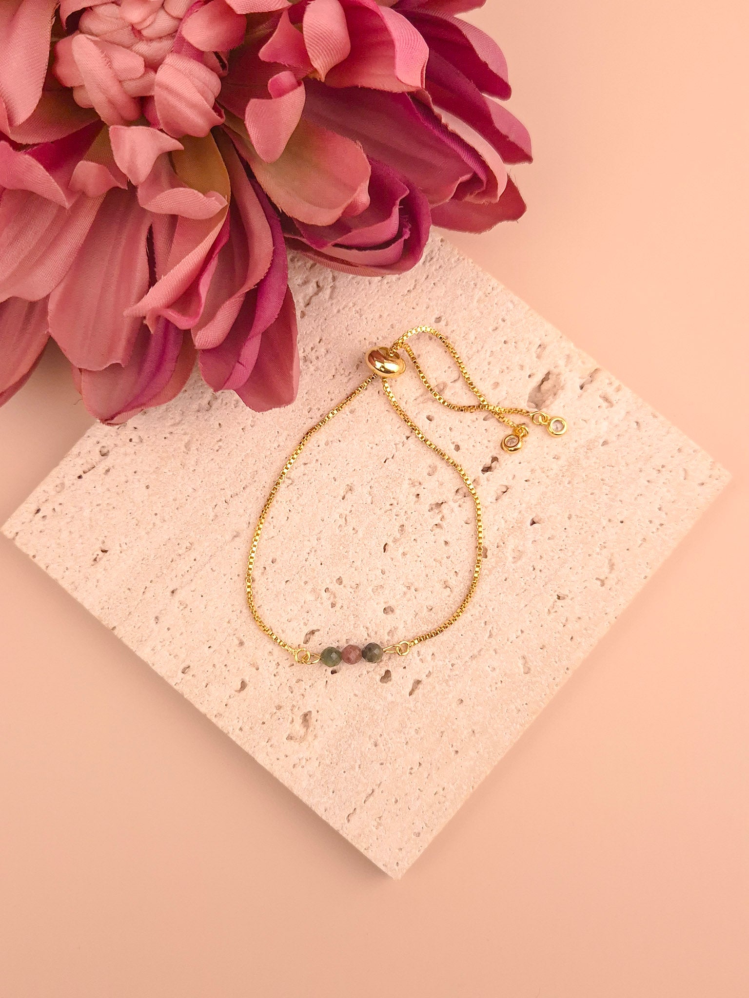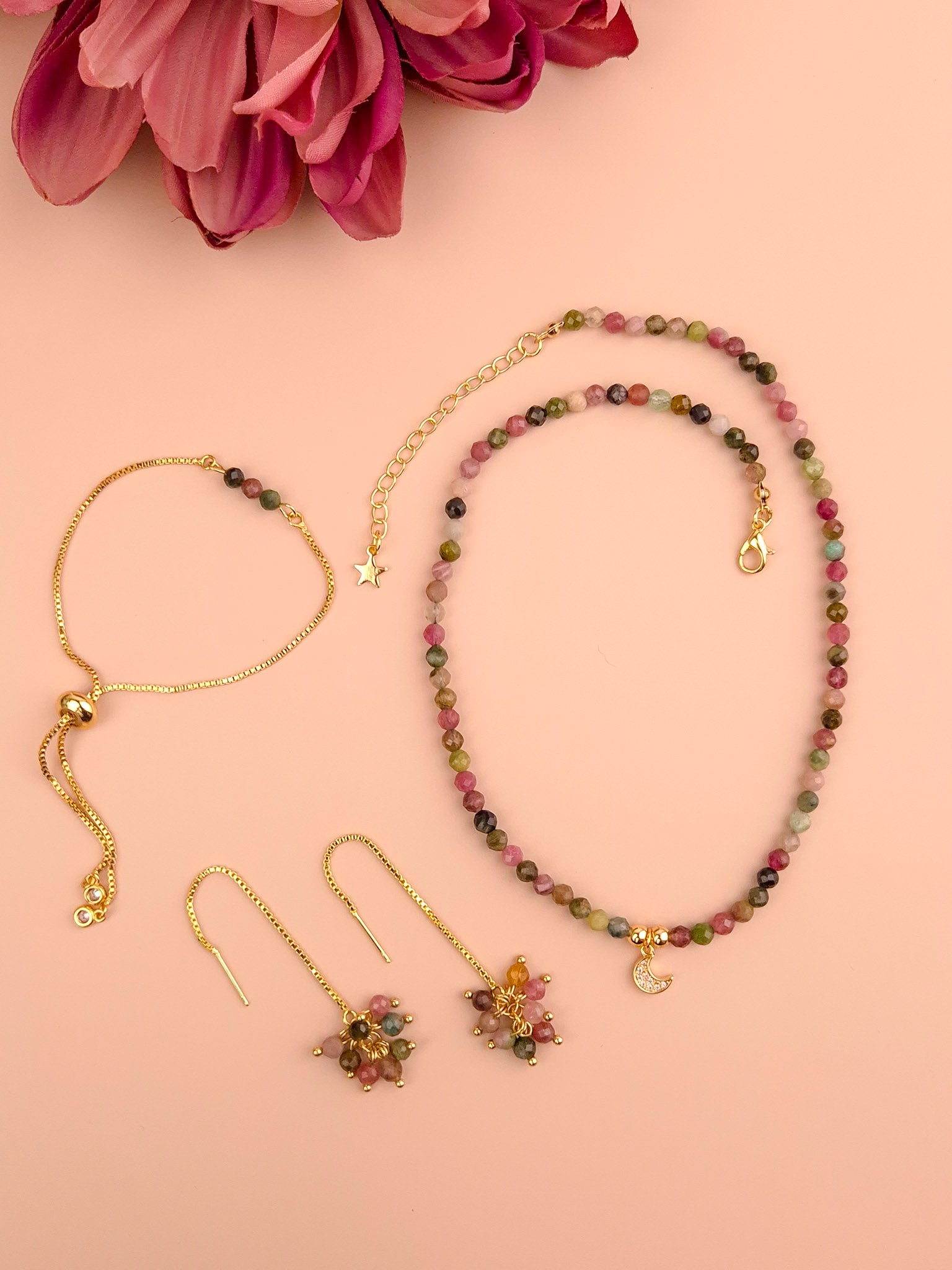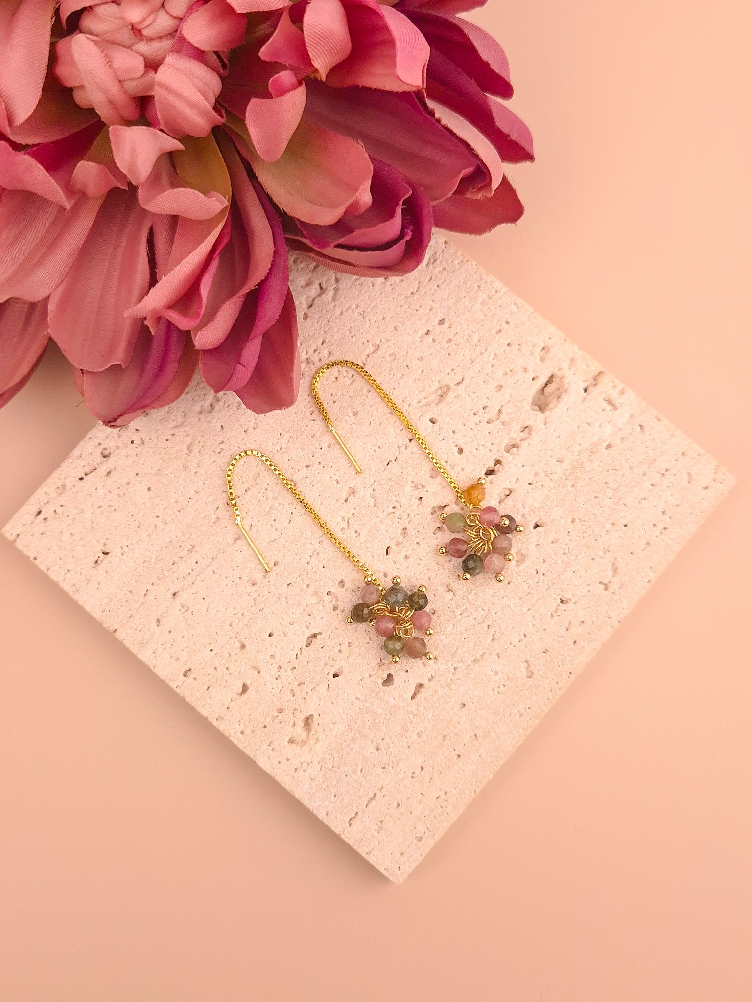 Earrings: Threader-style long drops with Watermelon Tourmaline clusters [Drop Length: ~5.5 cm]