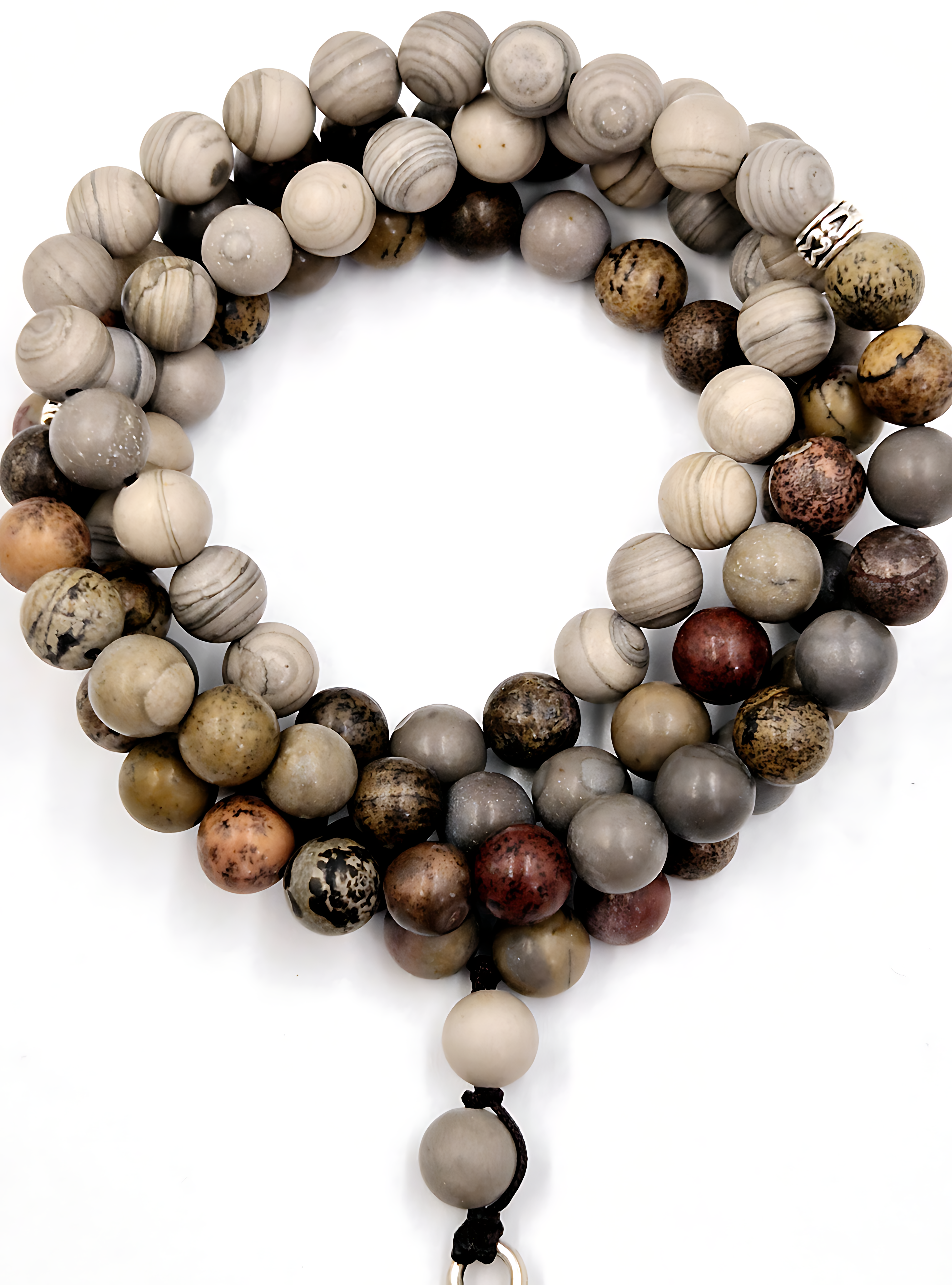 Inspired by the untamed beauty of nature, this prayer bead set alternates between the striking patterns of Leopard Skin Jasper and the grounding tones of Grey Jasper, creating a harmonious blend of earth’s artistry. Leopard Skin Jasper, named for its mesmerizing, animal-like markings, has been admired since ancient times for its resemblance to nature’s fiercest landscapes. With its muted, smoky elegance, Grey Jasper is formed over millions of years as sediments compact into resilient stone. Together, they create a bead set that tells a story of wilderness, endurance, and the rugged beauty of the natural world.